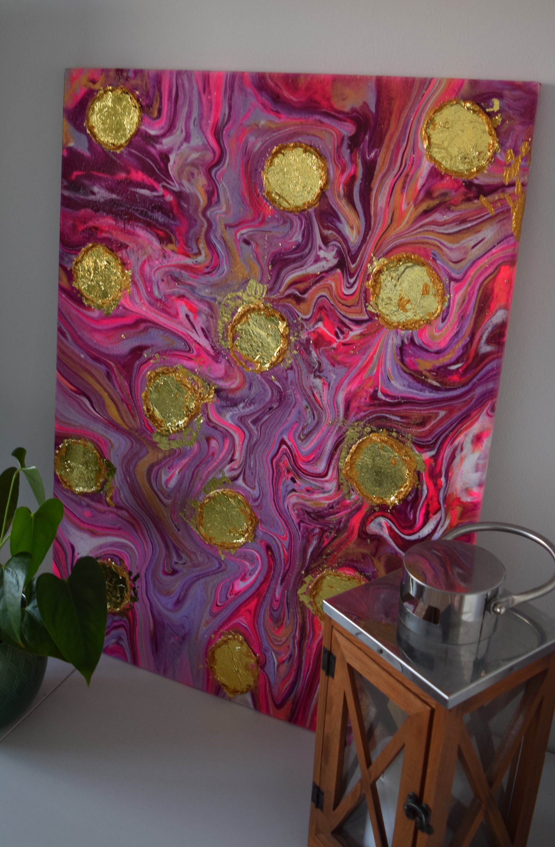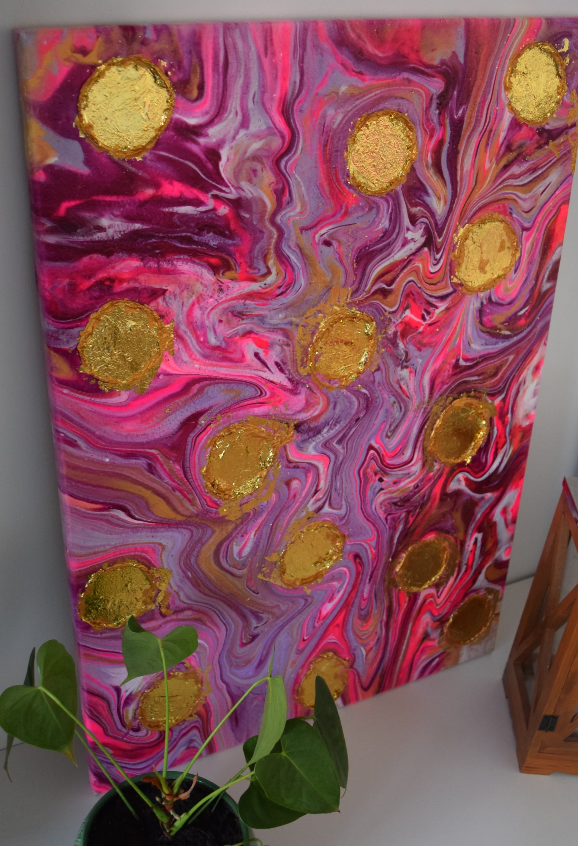Das Bild wurde mit Acrylgiestechnik/-pouring gemalt und zum Schutz der Farben mit Acryllack versiegelt.